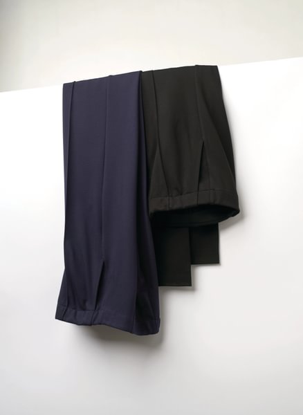 Slim leg, stretch waistband, full length sewn in front crease, mock fly, 2 side pockets.
