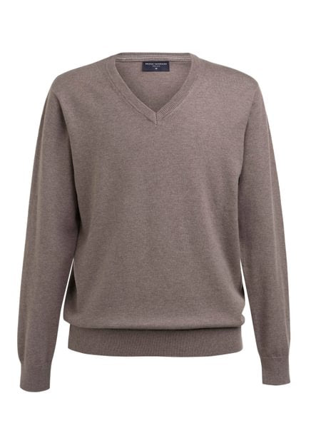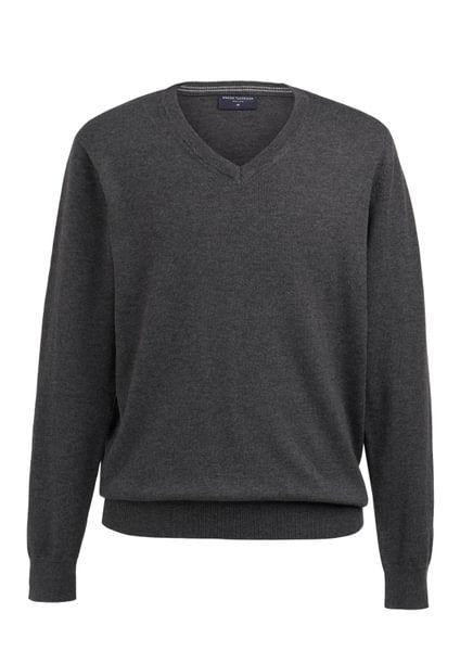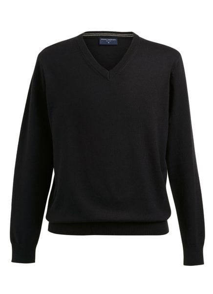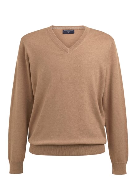 Pull à col en V, col, poignets et ourlet côtelés, détail contrasté à l'intérieur du col.