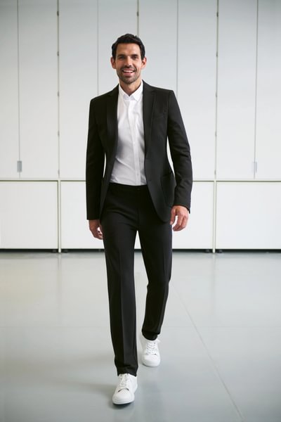 Coupe ajustée, taille élastiquée, devant plat, 2 poches latérales, 2 poches sur les hanches, passants de ceinture.
