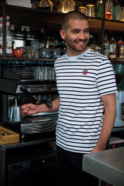 Manches courtes, encolure côtelée, surpiqûres doubles à l'ourlet et aux poignets.