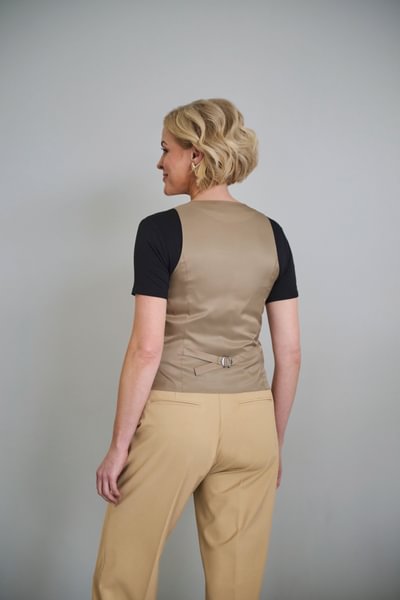Tailored fit, 5 button front, lining back with adjuster, 2 narrow welt pockets.